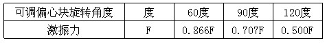 振動(dòng)電機(jī)每端出軸均有一個(gè)固定偏心塊和一個(gè)可調(diào)偏心塊,調(diào)節(jié)可調(diào)偏心塊和固定偏心塊之間的夾角可改變激振力的大小。出廠時(shí)可調(diào)偏心塊和固定偏心塊之間的夾角為0度,這時(shí)的激振力為振動(dòng)電機(jī)的額定激振力F,不同夾角時(shí)的激振力如表: